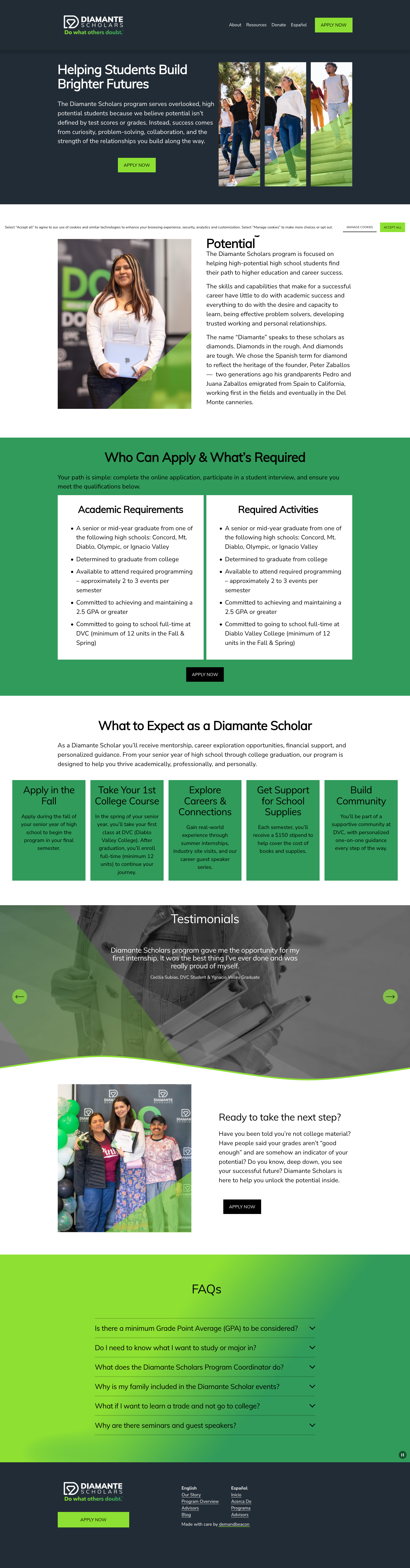 We designed a clean, student-first website on a platform their staff can actually use — no developer needed, no tickets, no waiting. The new site reflects what Diamante Scholars is all about: helping high-potential students build brighter futures.